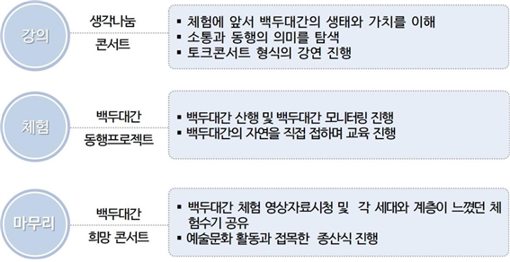 - 전문가와 함께하는 백두대간 산행을 통해 백두대간의 자연을 직접 접하고 모니터링하며 생태적 감수성 향상 도모